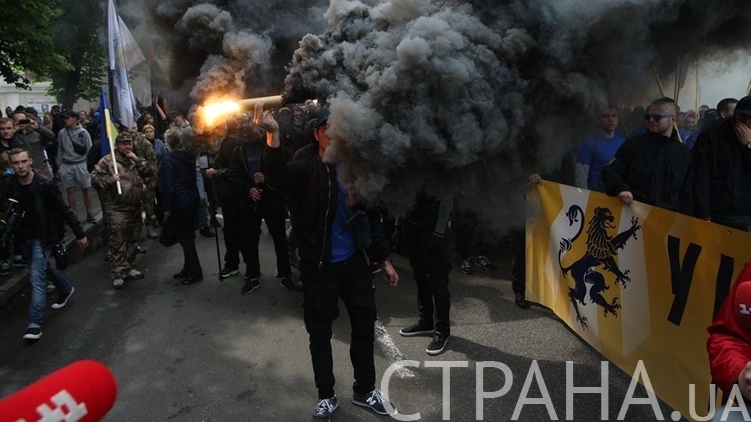 После выступления Билецкого наступает кульминационная часть митинга. Участники марша потуже натягивают платки на лица и выставляют вперед файера. По команде они выдергивают чеку. Площадь перед Радой мгновенно становится красной, все заволакивает дымом. Журналисты, матерясь, отворачиваются от искр. Все действие длится не больше двух минут, но впечатление произвело весьма мощное.