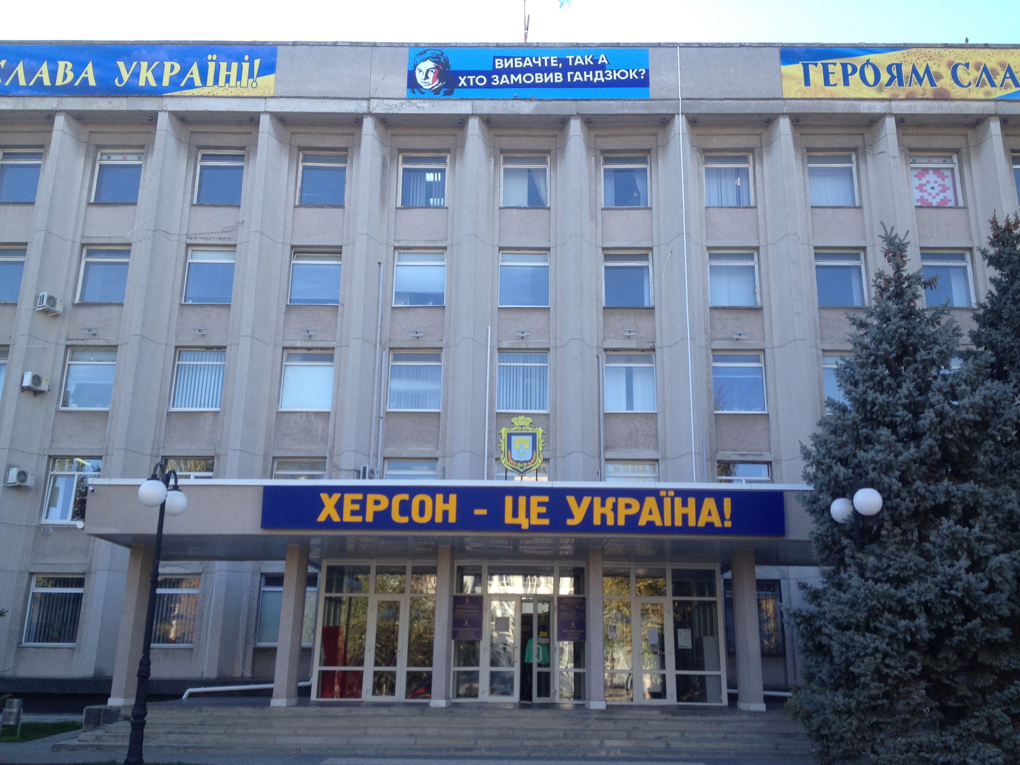 Растяжка с надписью "Извините, так кто заказал Катю Гандзюк?" на мэрии Херсона