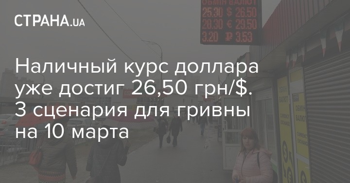 Обвал цен на нефть и мировых финансовых рынков спровоцировал 9 марта ажиотаж и резкое подорожание доллара на наличном рынке в Украине. У немногих работающих банков наличный валютный курс на продаже людям подскочил в среднем на 5-7 копеек и достиг 25,20 грн/$. В частности, такой ценник ставил коммерческий А-Банк и государственный Укргазбанк. Минимальная стоимость составила 24,95 грн/$ (Кредобанк).