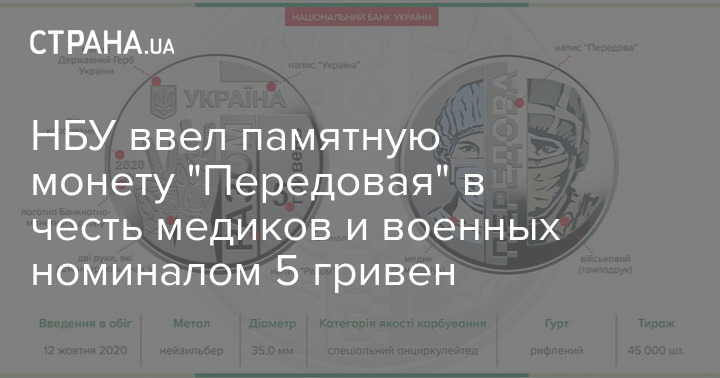 Национальный банк Украины с 12 октября ввел в обращение новую памятную монету "Передовая". Ее номинал составляет 5 гривен.