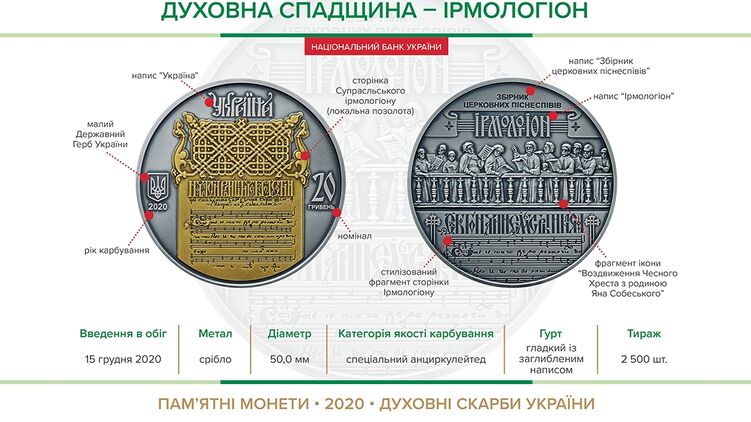 Так, памятная монета входит в серию "Духовные сокровища Украины". Она посвящена наследию древней духовной песенной традиции, распространенной с конца XVI в. на всей этнической территории украинцев и белорусов, в частности, нотным сборникам различных жанров литургического пения - Ирмологион.