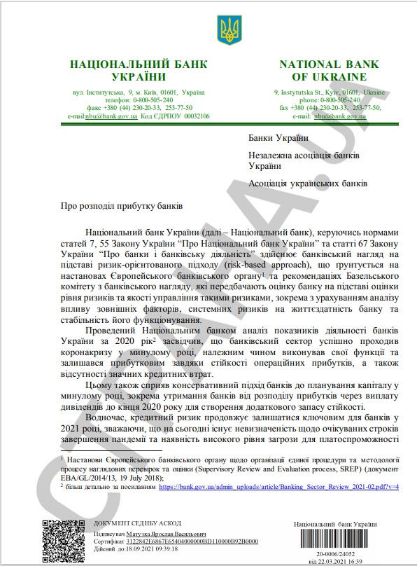 Какое-то время это были лишь слухи, а сейчас появилось внутреннее письмо регулятора №20-0006/24052, в котором он настоятельно рекомендует банкам не выплачивать дивиденды акционерам до завершения проверок НБУ.