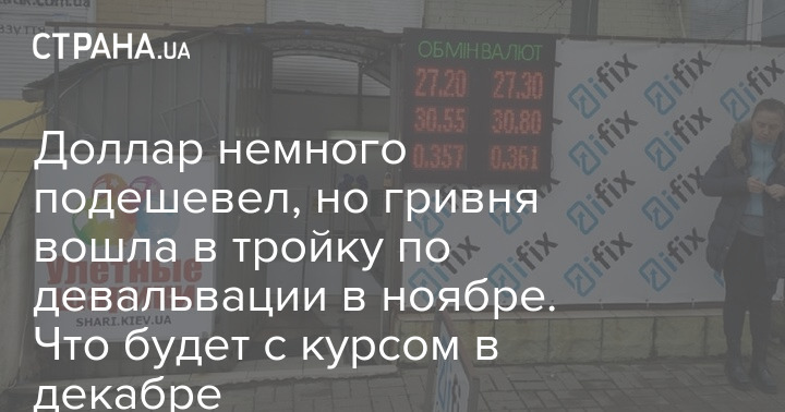 Если говорить о безналичной гривне, то она за месяц девальвировала на 90 копеек: с 26,27 грн/$ в последний рабочий день октября (29 октября) до 27,17 сегодня, 30 ноября.
