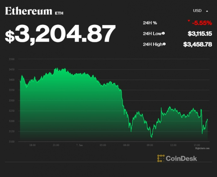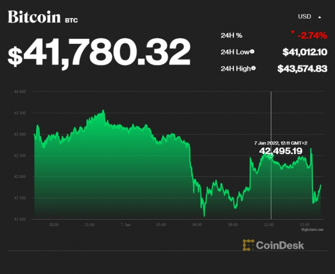 По данным CoinDesk, по состоянию на 16:19 7 января (по Киеву) биткоин торговался по 41 800 долларов, Etherum – 3 209 дол.