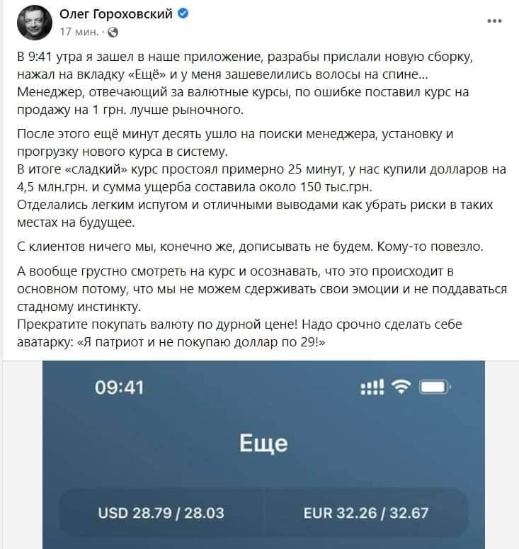 Сегодня некоторым пользователям Монобанка очень крупно повезло - они смогли купить доллар по курсу на гривню ниже рыночного (рыночный был 29, а выставили 28.03). Об этом рассказал один из сооснователей Монобанка Олег Гороховский.