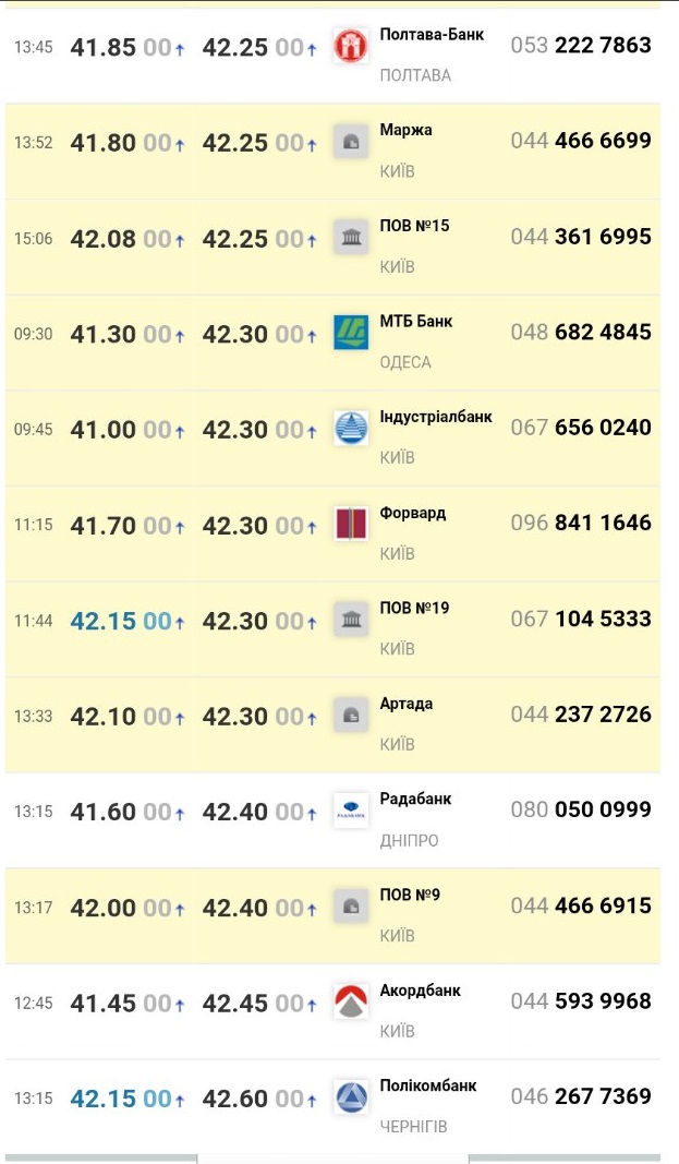 В банках ситуация еще сложнее. Там максимальный курс продажи наличного доллара сегодня подскочил на 20 копеек, и достиг 42,60 грн/$ — максимум с начала войны. Этот ценник ставил Поликомбанк. Многие держали курсы в районе 42,30-42,45 грн/$: Аккордбанк, Радабанк, Forward Bank, Индустриалбанк, МТБ Банк.