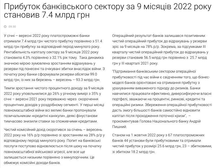 Украинские банки остаются прибыльными, несмотря на войну. Прибыль банков за первые 9 месяцев этого года составила 7,4 млрд грн, что в семь раз меньше, чем за такой же период прошлого года (51,4 млрд).