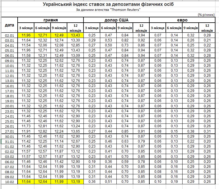 Из него видно уменьшение вложений физлиц в гривне — на 2% (до 581 млрд грн). При этом на 2,6% подросли валютные сбережения, которые к началу февраля составили $9,4 млрд.