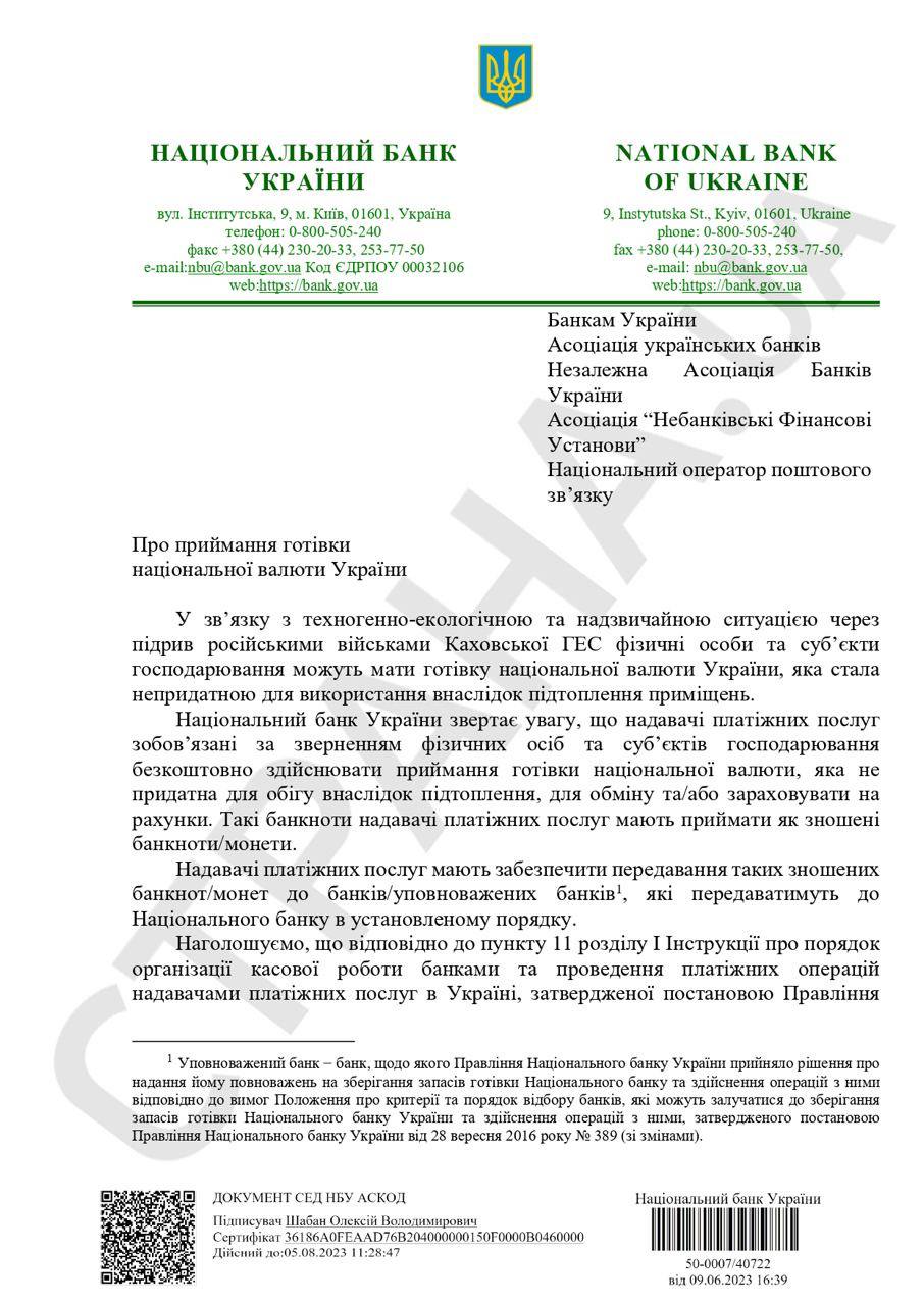 НБУ ждет притока в денежный оборот Украины наличной гривны, поврежденной водой, химическими веществами или огнем в связи с подрывом Каховской ГЭС и затоплением больших территорий.