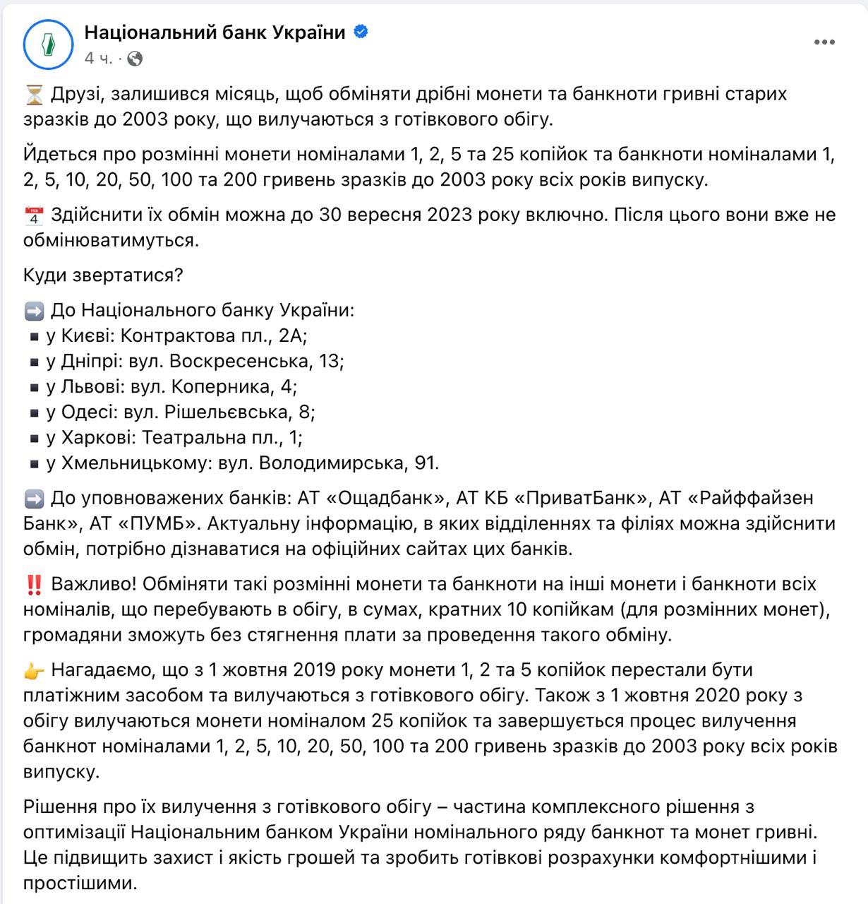 Чтобы обменять монеты и гривны старых образцов, которые изымаются из обращения, ещё есть месяц