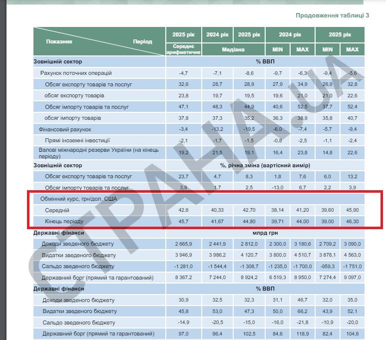 • 2025 год: 45,90 грн/$ — средний; 46,30 грн/$ — на конец года;