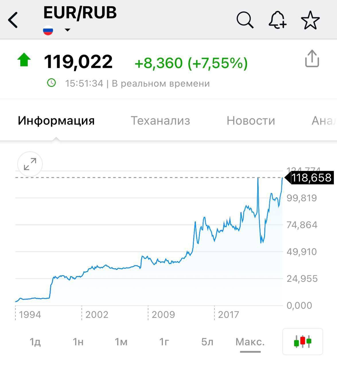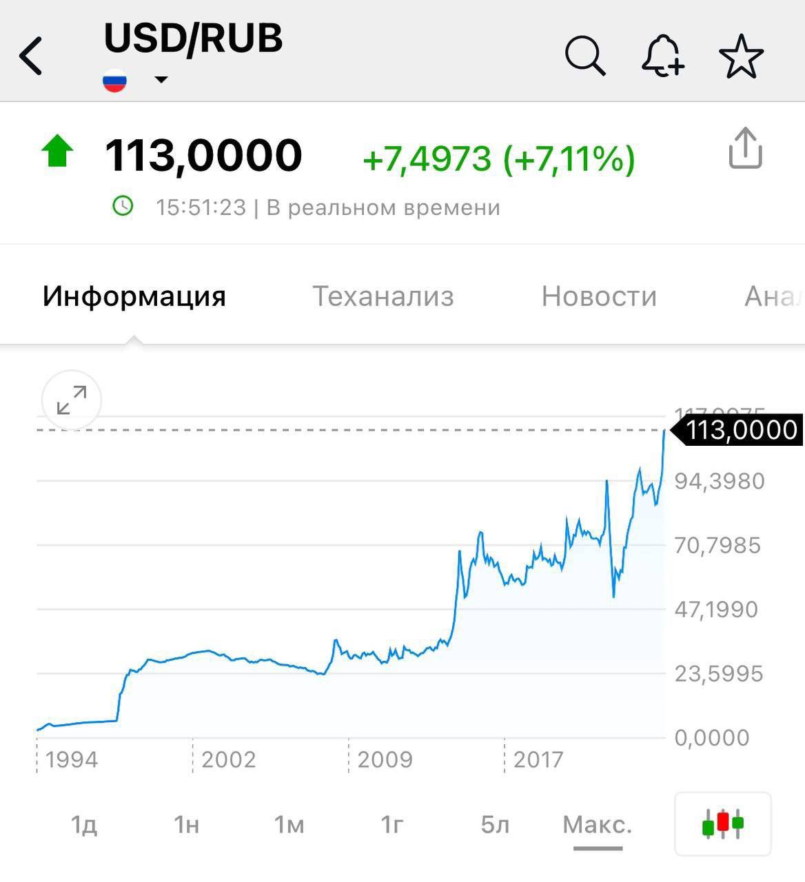 Российский рубль продолжает быстро опускаться. Курс доллара на российской бирже сегодня превысил 113 рублей, евро уже выше 119 рублей, а юань - 15.
