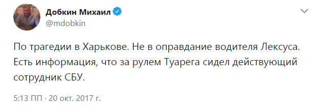 Кроме этого, в сети появилась информация, что за рулем автомобиля Volkswagen Touareg находился действующий сотрудник Службы безопасности Украины.