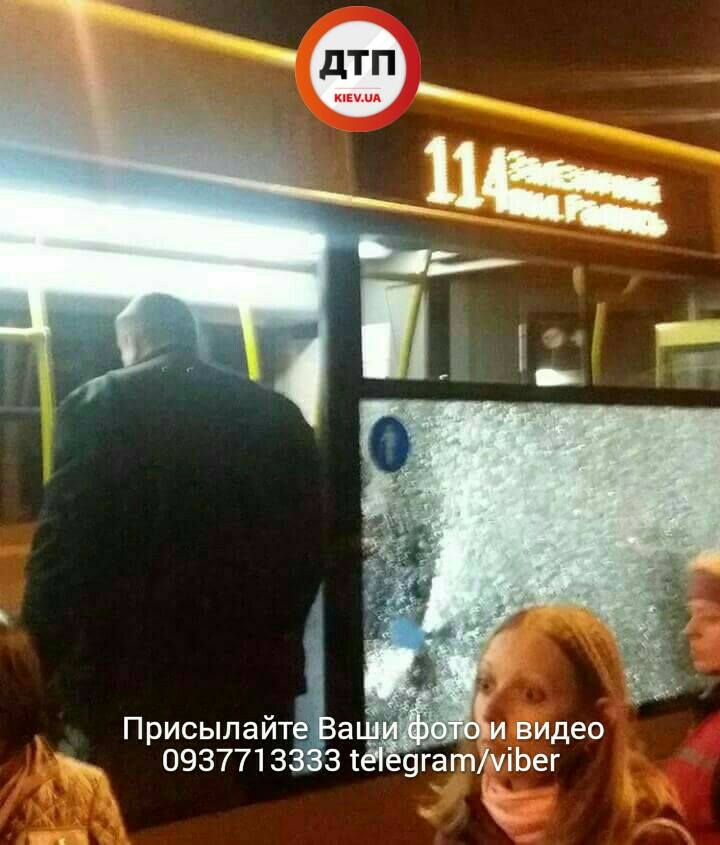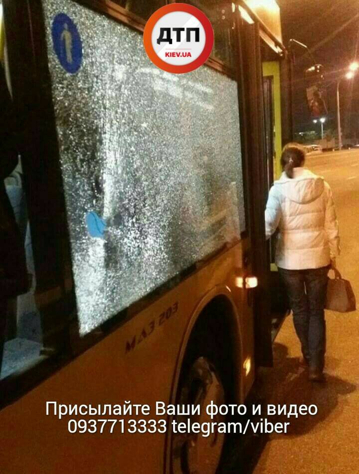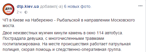 "ЧП в Киеве на Набережно-Рыбальской в ​​направлении Московского моста. Двое неизвестных мужчин бросили камень в окно 114 автобуса. Пострадала девушка", - говорится в сообщении.