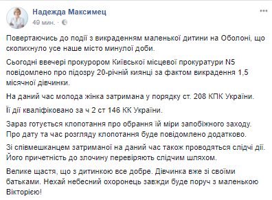 Вчера, 21 октября, прокурор киевской местной прокуратуры N5 сообщил о подозрении 20-летней киевлянке по факту похищения девочки возрастом 1,5 месяцев.