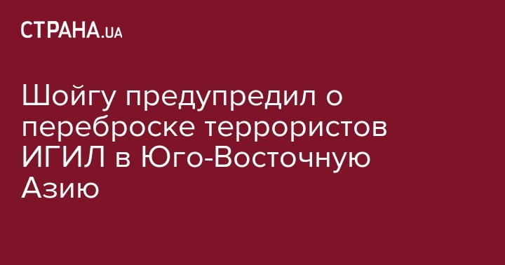 Министр обороны России Сергей Шойгу заявил о росте террористических угроз в Юго-Восточной Азии. Это происходит, в том числе, из-за ухода террористов ИГИЛ из Сирии и Ирака, передает РИА Новости.