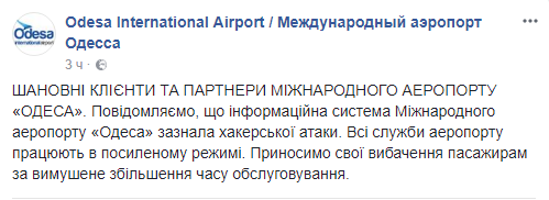 Также пресс-служба одесского аэропорта сообщила на своей странице в Facebook о хакерской атаке.