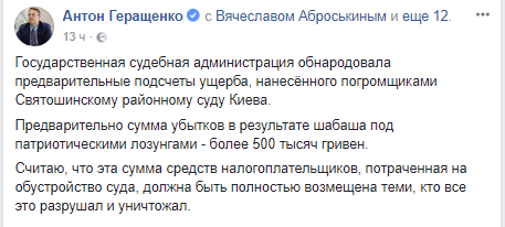 Нардеп, советник главы МВД Антон Геращенко заявил, что предварительная сумма убытков в результате погрома в Святошинском суде Киева, где проходило заседание по Коханивскому, превышает 500 тысяч гривен. Об этом он написал в Facebook.