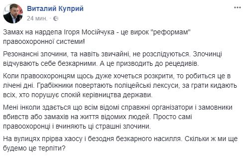 "Покушение на нардепа Игоря Мосийчука - это приговор "реформам" правоохранительной системы! Резонансные преступления, и даже обычные, не расследуются. Преступники чувствуют себя безнаказанными. А это приводит к рецидивам. Когда правоохранителям что-то очень хочется раскрыть, то делается это в считанные дни. Грабители возвращают полицейские лексусы, за решетку бросают всех, кто нарушает покой руководства государства", - возмущается нардеп Виталий Куприй.