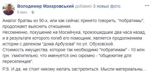 "Несомненно, покушение на Мосийчука, произошедшее два часа назад, и в результате которого погиб его помощник, является продолжением истории с дележом "дома Арбузова" по ул. Обуховской. Стоимость имущества, которое так необходимо "побратимам" - 10 млн грн. Умилительно, что именуется оно скромно - "общежитие для переселенцев"", - считает политолог Владимир Макаровский.