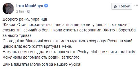 Народный депутат от Радикальной партии Игорь Мосийчук рассказал о состоянии своего здоровья после взрыва у телеканала "Эспрессо", в котором погибли двое человек. Об этом нардеп написал на странице в Facebook.