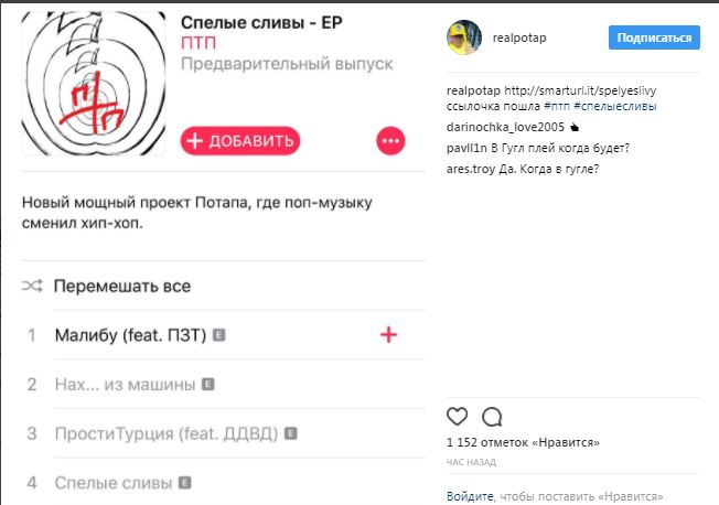 Артист теперь выступает под псевдонимом ПТП. На странице в Instagram Потап также сообщил, что уже выпустил дебютный миниальбом своего проекта под названием "Спелые сливы". Продюсер добавил, что мини-альбом "Спелые сливы" состоит из четырех треков.
