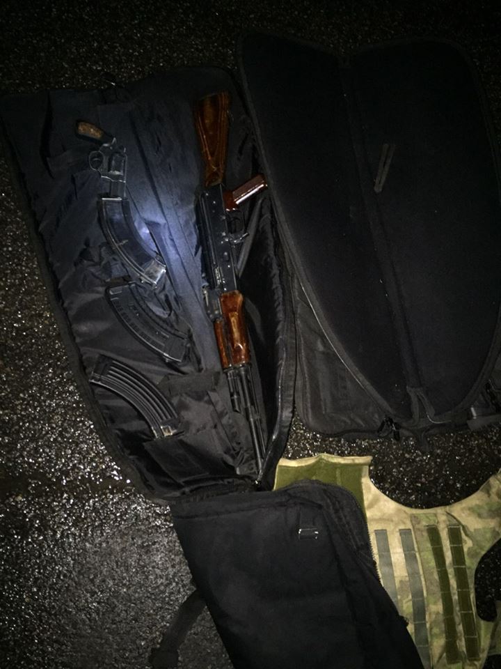 В полиции заявили, что во время осмотра автомобиля "было обнаружено большое количество оружия". В качестве доказательства была обнародована фотография, на которой изображены предмет, похожий не револьвер, а также автомат Калашникова и три магазина к нему.