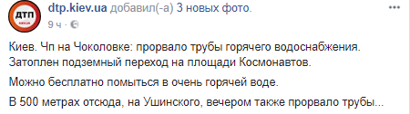 В воскресенье, 29 октября, на Чоколовском бульваре в Соломенском районе Киева прорвало трубы горячего водоснабжения. Об этом в Facebook сообщает dtp.kiev.ua.