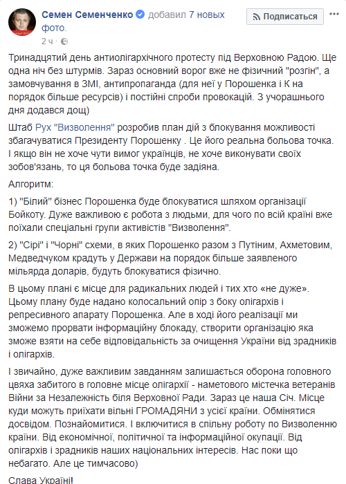 Один из лидеров МихоМайдана, нардеп Семен Семенченко ("Самопомощь") описал на ФБ дальнейший план действий по блокирования бизнес-активов президента Петра Порошенко.