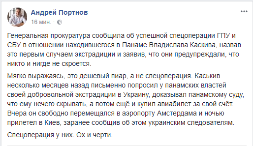 "Мягко выражаясь, это дешевый пиар, а не спецоперация. Каськив несколько месяцев назад письменно попросил у панамских властей своей добровольной экстрадиции в Украину, доказывал панамскому суду, что ему нечего скрывать, а потом еще и купил авиабилет за свой счет. Вчера он свободно перемещался в аэропорту Амстердама и ночью прилетел в Киев, заранее сообщив об этом украинским следователям. Спецоперация у них. Ох и черти", - пишет Портнов.