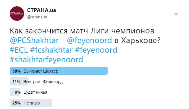 Подавляющее большинство читателей "Страны", которые приняли участие в опросе, опубликованном в Twitter, уверены в победе украинской команды.