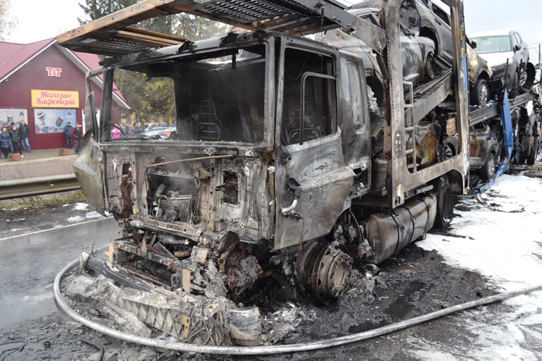 В 13.10 пожар удалось локализовать, а в 14:30 – полностью потушить. Огнем уничтожена кабина водителя, моторный отсек автомобиля DAF и шесть легковых автомобиля марки Hyundai Tucson.