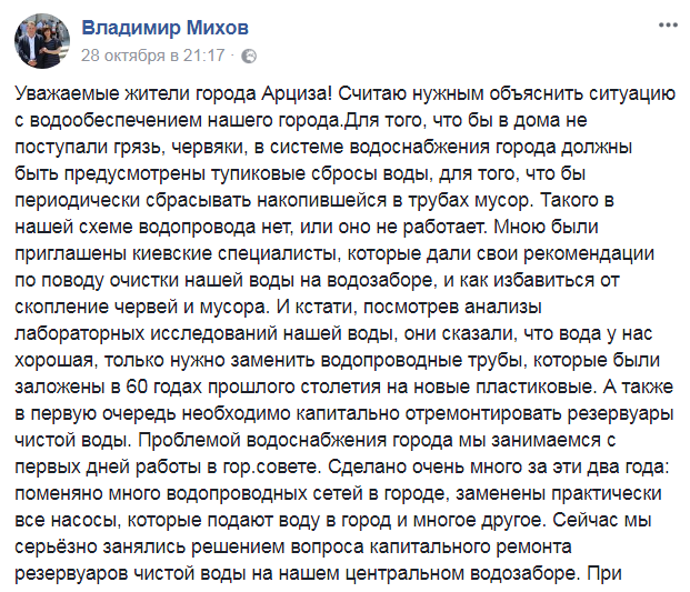 Городской голова Владимир Михов, активный пользователь Facebook, на проблему с водой отреагировал также в соцсети. В частности, он пояснил, что ситуацию могли бы решить "тупиковые сбросы воды". Это необходимо для того, что бы периодически сбрасывать мусор, накопившийся в трубах.