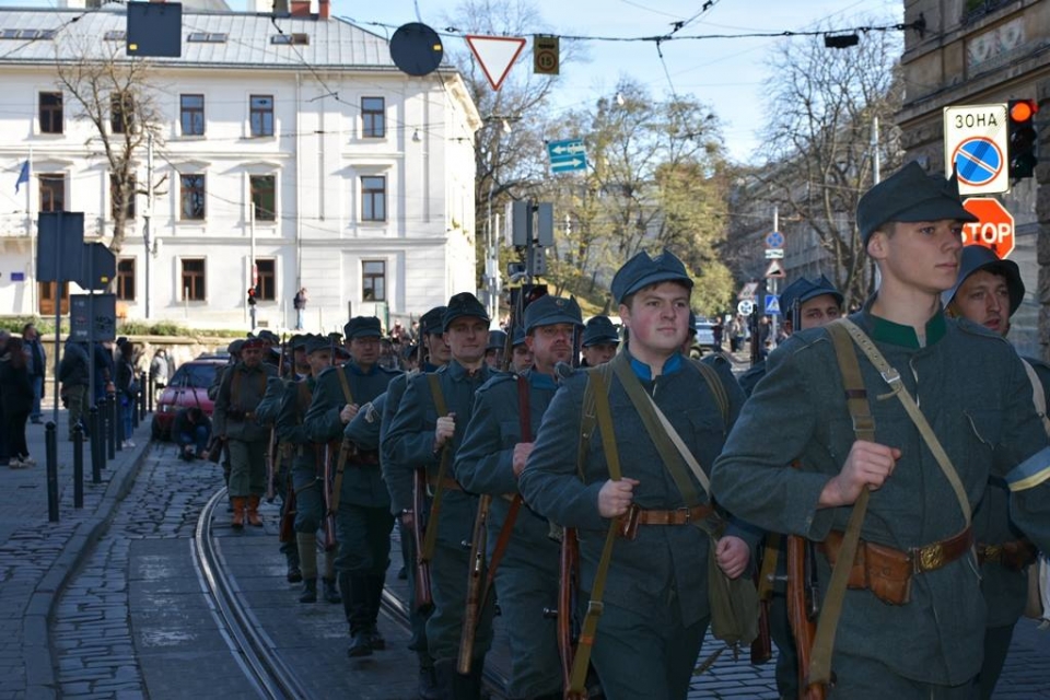 Около 60 жителей города и участников реконструкции из других областей Украины в форме Украинской Галицкой армии прошли от сквера "На Валах" через проспект Свободы до площади Рынок.