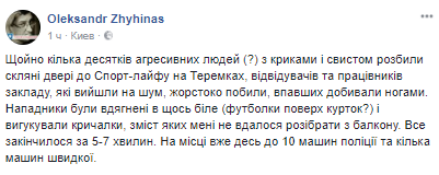 " ...Несколько десятков агрессивных людей (?) с криками и свистом разбили стеклянные двери в Спорт-лайф на Теремках, посетителей и работников заведения, которые вышли на шум, жестоко избили, упавших добивали ногами. Нападавшие были одеты в нечто белое (футболки поверх курток?) и выкрикивали кричалки, смысл которых мне не удалось разобрать с балкона. Все закончилось за 5-7 минут. На месте уже где-то до 10 машин полиции и несколько машин "скорой", - пишет свидетель драки Александр Жигинас в Facebook.