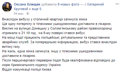Сегодня, 5 ноября, в результате взрыва на улице Донецкой в ​​Киеве погибла женщина, еще одну пострадавшую с телесными повреждениями доставили в больницу.