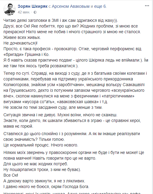 "Читаю некоторые заголовки в СМИ и даже сам вздрагиваю от ужаса)). Друзья, все Ок! Какое избиения, о чем вы? Никаких проблем, со мной все прекрасно! Никто меня не побил и ничего страшного со мной не произошло. Живее всех живых. Не дождутся)!", - радостно пишет Шкиряк.
