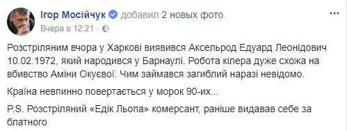 После того, как в Харькове мужчина был расстрелян в своем автомобиле, нардеп от Радикальной партии Игорь Мосийчук раскрыл в Facebook личность погибшего.