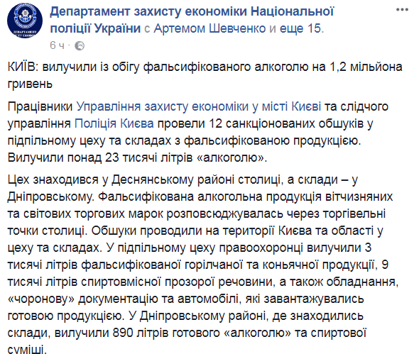 "Цех находился в Деснянском районе столицы, а склады - в Днепровском. Фальсифицированная алкогольная продукция отечественных и мировых торговых марок распространялась через торговые точки столицы", - говорится в опубликованном сообщении.