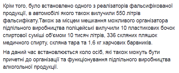 "В подпольном цехе правоохранители изъяли 3 тысячи литров фальсифицированной водочной и коньячной продукции, 9 тысяч литров спиртосодержащего прозрачного вещества, а также оборудование, "черновую" документацию и автомобили, которые загружались готовой продукцией. В Днепровском районе, где располагались склады, изъяли 890 литров готового "алкоголя" и спиртовой смеси. Кроме того, был установлен один из реализаторов фальсифицированной продукции, в автомобиле которого также изъяли 550 литров фальсификата", - отметили в полиции.