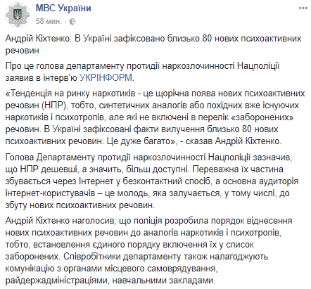 Глава департамента противодействия наркопреступности Нацполиции Андрей Кихтенко заявил, что в Украине зафиксировали около 80 новых психотропных веществ. Об этом сообщает пресс-служба МВД в Facebook.