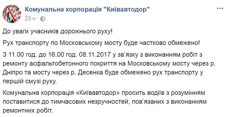 "С 11:00 до 18:00 09.11.2017 в связи с выполнением работ по ремонту асфальтобетонного покрытия на Южном мостовом переходе в направлении движения с пр. Николая Бажана на Надднепрянское шоссе будет частично ограничено движение транспорта в первой полосе движения", – говорится в сообщении "Киевавтодора".