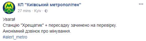 В данный момент движение через станцию метро "Дворец спорта" возобновили, но станцию метро "Крещатик" и переход на "Майдан Незалежности" (синяя ветка) закрыты на проверку. Об этом сообщает киевский метрополитен в соцсети.
