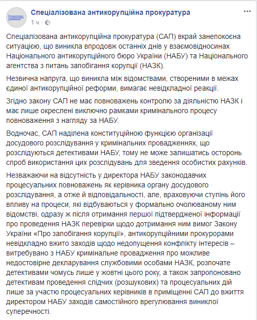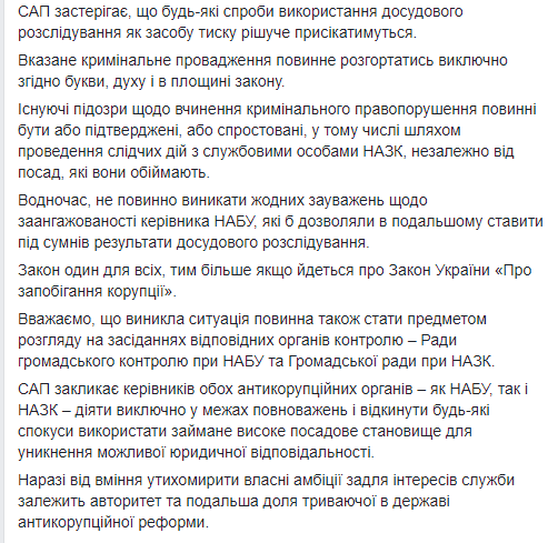"САП наделена конституционной функцией организации досудебного расследования в уголовных производствах, расследуемых детективами НАБУ, поэтому не может оставаться в стороне от попыток использования этих расследований для сведения личных счетов", - говорится в сообщении.
