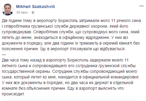 "Два часа назад в аэропорту Борисполь задержали моего 11-летнего сына и сопровождавшего его сотрудника грузинской службы государственной охраны. Сотрудник службы, сопровождающий моего сына, который летит ко мне, находится в официальной командировке", - написал Саакашвили на своей странице в соцсети Facebook в пятницу.