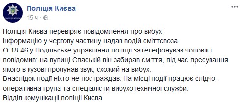 В пятницу вечером, 10 ноября, недалеко от станции метро "Контрактовая площадь" на Подоле в Киеве, работники коммунальной службы на мусоровозе забирали мусор из баков. Во время прессования в кузове раздался звук, похожий на взрыв. Об этом сообщает пресс-служба ГУ НП в Киеве на своей странице в Facebook.