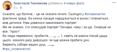 "Сказать, что это больно, – это не сказать ничего. Сегодня у нас фактически траур. Потому что каждая локация рождается в муках и ее лелеют, как ребенка. Нам пришлось зарисовать портрет. Мы не знаем, кто испортил портрет Гончара, почему и за что. Скорее всего, "просто". Потому что люди преимущественно, простите, быдло. И, даже не имея иллюзий по этому поводу, каждый раз удивляешься, как еще можно пробить дно", – написала активистка.