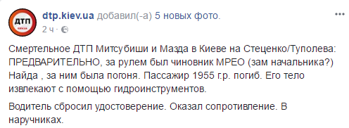 Издание dtp.kiev.ua также утверждает, что за рулем  Mazda был чиновник из сервисного центра (МРЭО): "Водитель сбросил удостоверение. Оказывал сопротивление. В наручниках".