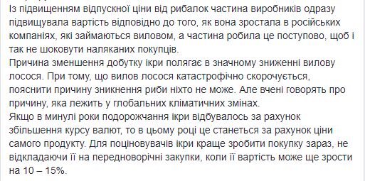 Если в прошлом году подорожание икры происходило за счет увеличения курса валют, то в этом году это произойдет за счет цены самого продукта. В связи с глобальными  климатическими изменениями происходит значительное уменьшение вылова лосося и увеличение его цены.