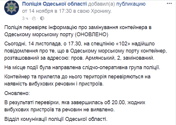 Около 17:30 вторника, 14 ноября неизвестный позвонил по спецлинии "102" и сообщил о, якобы, находящемся на территории Одесского порта взрывном устройстве.